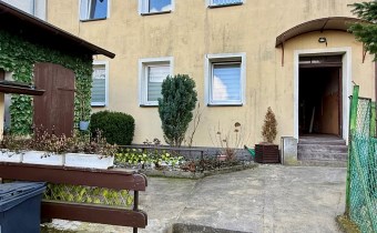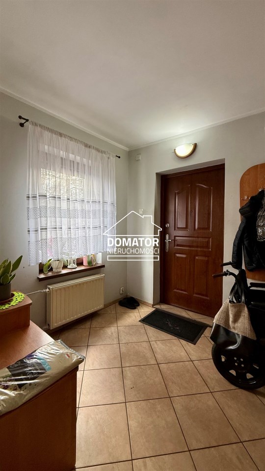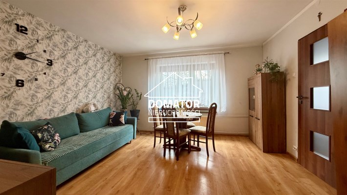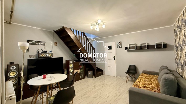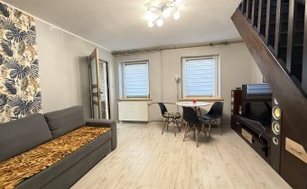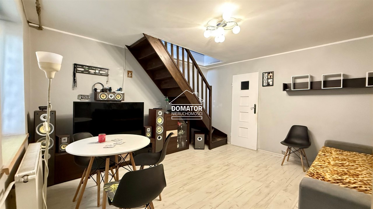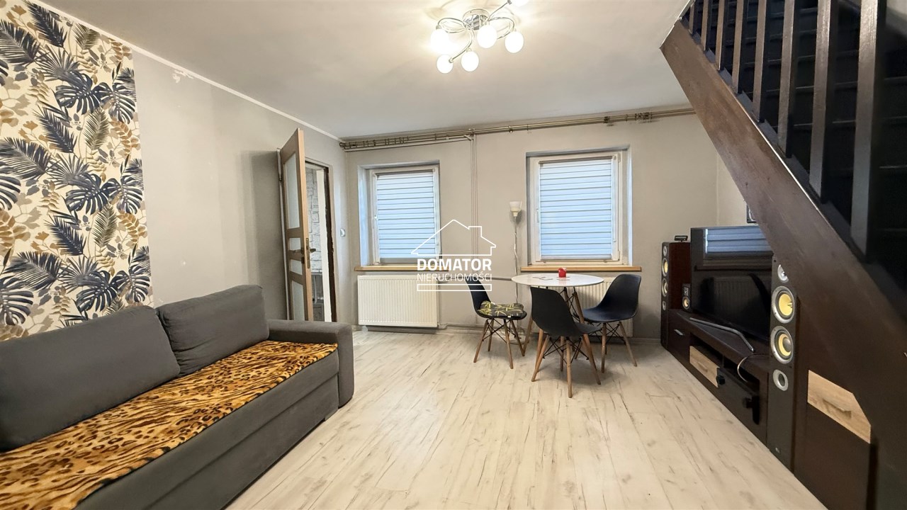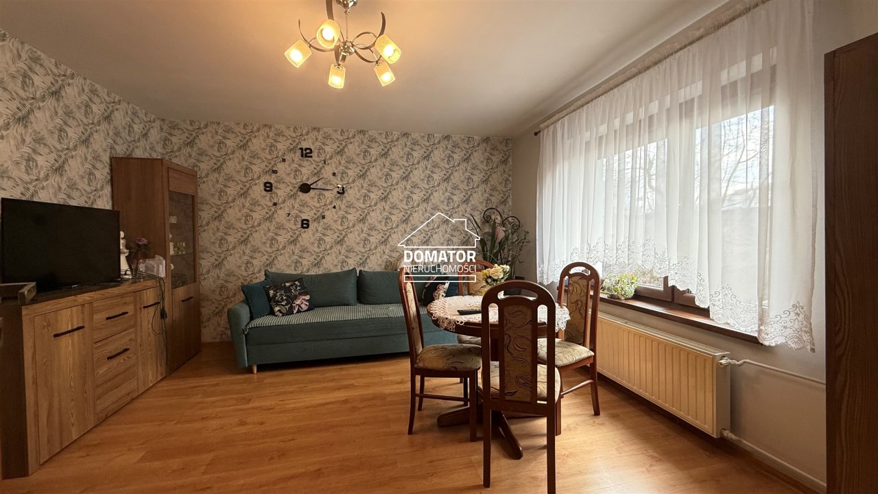 składa się z dwóch pokoi, łazienki z WC oraz oddzielnej, dużej i jasnej kuchni. Z drugiego pokoju prowadzą schody do dolnej części mieszkania o powierzchni 31,87 m², w której znajdują się dwa dodatkowe pokoje. Każde mieszkanie posiada oddzielną Księgę Wieczystą i oddzielne wejścia. Garaż na terenie podwórka z oddzielnym wjazdem zamykanym bramą. Ogrzewanie centralne piecem na węgiel lub ekogroszek z możliwością wymiany na ogrzewanie gazowe . Woda ogrzewana bojlerem elektrycznym.