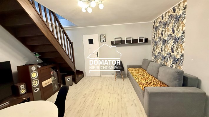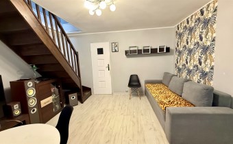 Mieszkanie dwupoziomowe usytuowane w kameralnym budynku z lat 60. Górna kondygnacja o powierzchni 51,56