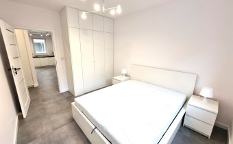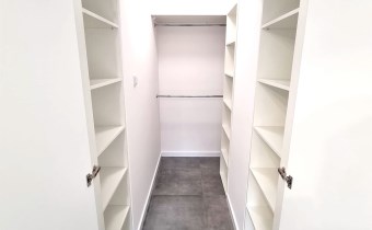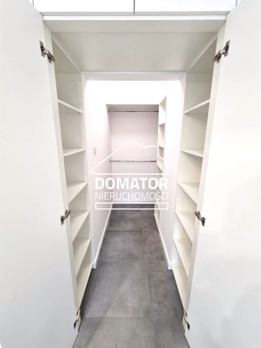 Wnętrze zostało funkcjonalnie przeprojektowane – z połączenia pomieszczeń powstała garderoba z wejściem przez szafę, co zwiększa komfort i przestrzeń użytkową.